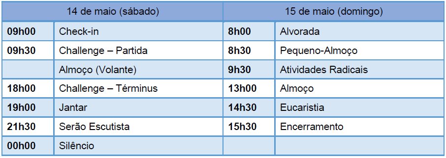 devidamente uniformizados. Na Eucaristia e no Encerramento devem estar uniformizados com a camisa, no resto da atividade podem usar a camisola de campo da secção (azul).